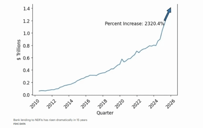 The official numbers make the structural change hard to dismiss. The FDIC said bank lending to NDFIs compounded at 21.9% a year from 2010 to 2024.
