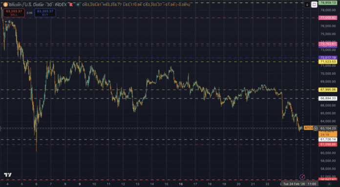 | Window low | Feb. 24, 05:00 UTC | Printed $62,717, first decisive push into the low $63k zone followed |