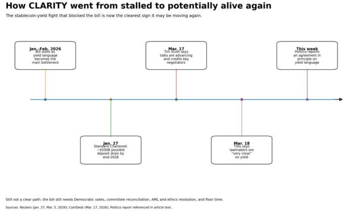 Senate Banking Chairman Tim Scott said as recently as Mar. 17 that negotiations were advancing, specifically crediting Senators Angela Alsobrooks, Thom Tillis, and White House adviser Patrick Witt on yield.