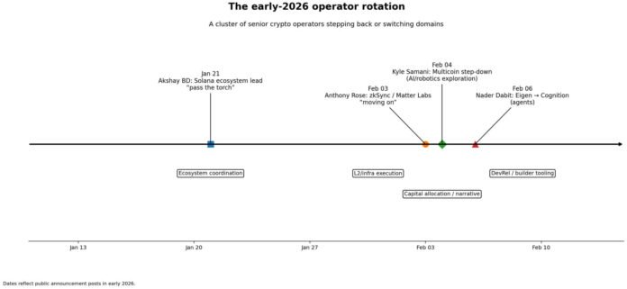 Within a span of weeks in early 2026, a cluster of senior crypto operators announced they were stepping back or switching domains.