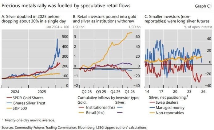 In a section on the late-January and February break in precious metals, the BIS said fund-flow data showed retail investors were the main source of inflows into gold and silver funds, while institutional investors “maintained stable positions or even trimmed exposure.”