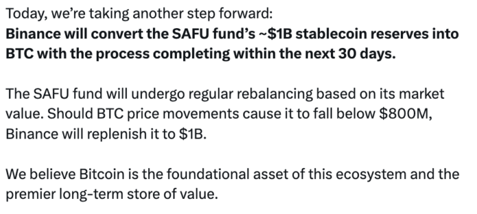 Binance said Friday it will convert the stablecoin holdings in its $1 billion Secure Asset Fund for Users (SAFU) entirely into bitcoin over the next 30 days.
