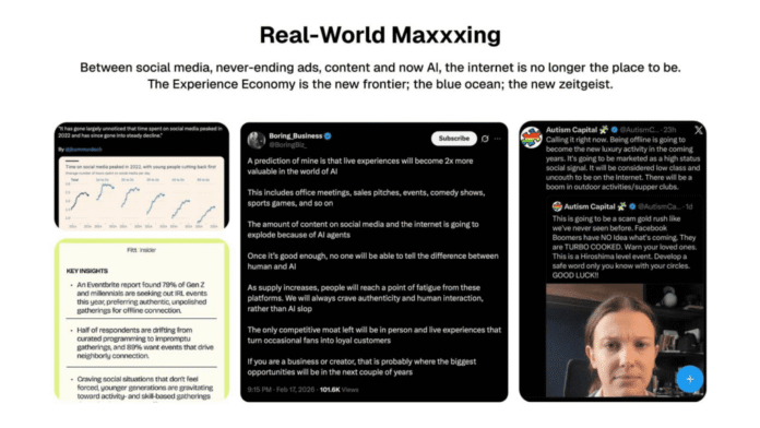 As AI fills social media, confusing and distorting whatever signal it once had, an exodus to real-world experiences has begun to take place. Some statistics show that social media usage peaked in 2022, a saturation induced by the COVID lockdowns that accelerated digital adoption of everything, only to remove its shine. Being online all the time is now ‘passé’.