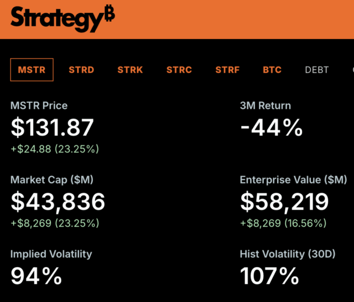Shares of Strategy ($MSTR) surged sharply Friday, lifting more than 25% at times, trading near $133, after a brutal prior session left the bitcoin‑linked stock deeply oversold.